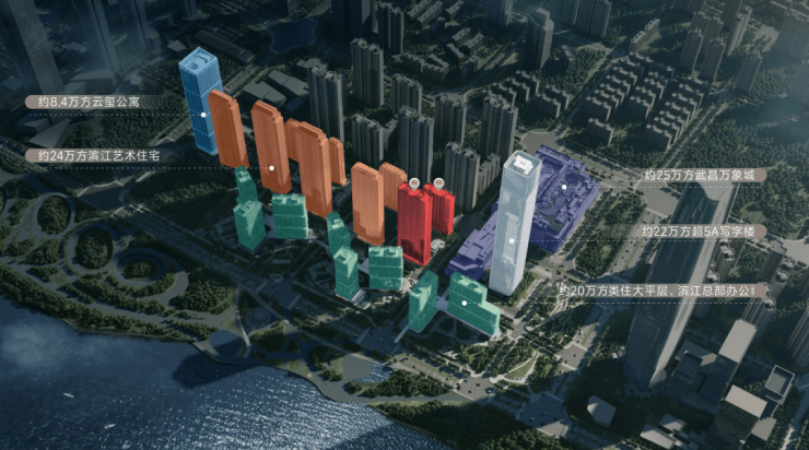 总建筑面积约163万方。地下城市环路、地铁枢纽;地面,月亮湾城市阳台与城市公园;地上,武昌万象城、约380米“长江之琴”的城市地标、“武汉长江中心”高端住宅群、“长江天际”商务大平层等。
