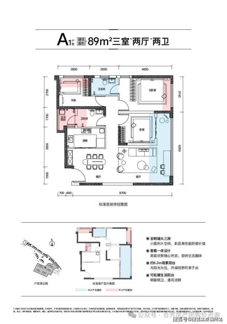 T6——89㎡ 全明端头三房,使用率约99.65%三房双卫双阳台、端头全明空间视野无遮挡景观面更大小面积大空间,公能齐全,满足三代同堂