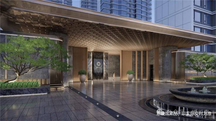 浅灰色石材与古铜色铝板筑底,彰显单元门头厚重“金石”质感;超3.6万方“晶钻”光幕立面公建化封窗设计,奢享全景视野;高约4.5米金属格栅。