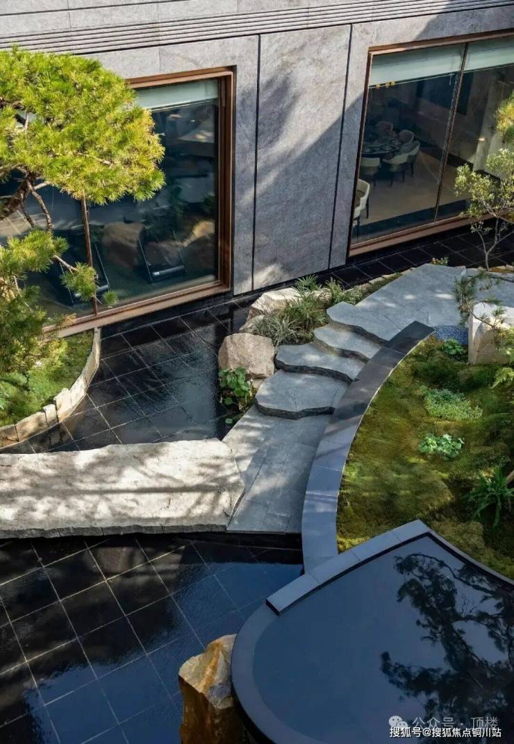 设计灵感源自传统车马院,打造出尊贵的环岛式落客前场,全冠移植的造型油松与迎宾水景静候一侧,大家望族的仪式感与排场感扑面而来。
