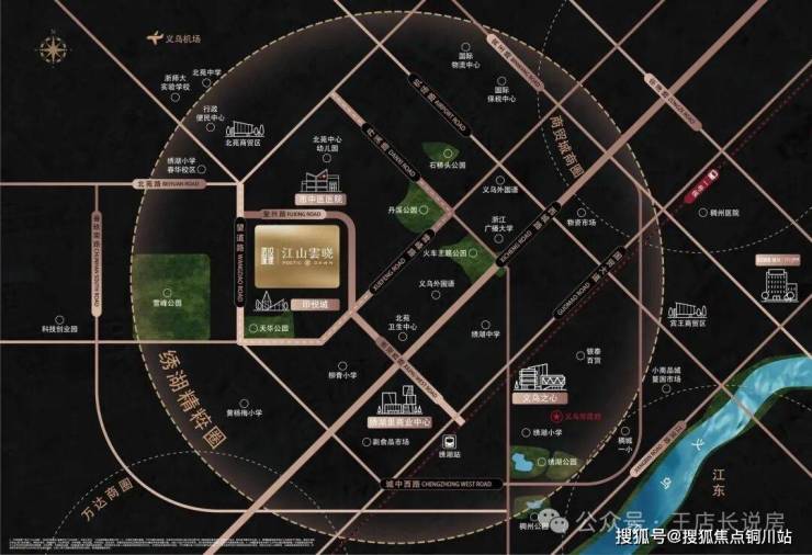 项目择址于绣湖精粹圈,坐拥世界义商起源,立足义乌中心位置,在四大商圈中价值居首,成为商圈矩阵的核芯,最大化掌握城市核心资源。除此之外,绣湖商圈是义乌城脉、商脉、文脉的发源地和向心地,拥有行政、商业、教育等城市重要坐标。项目周边直径约 2 公里范围内汇聚了义乌 TOP 级的配套资源,交通畅联城心内外、地标型商圈环伺、教育资源荟萃、公园景观叠翠,使得信息、资源、生活在这里高效交互。