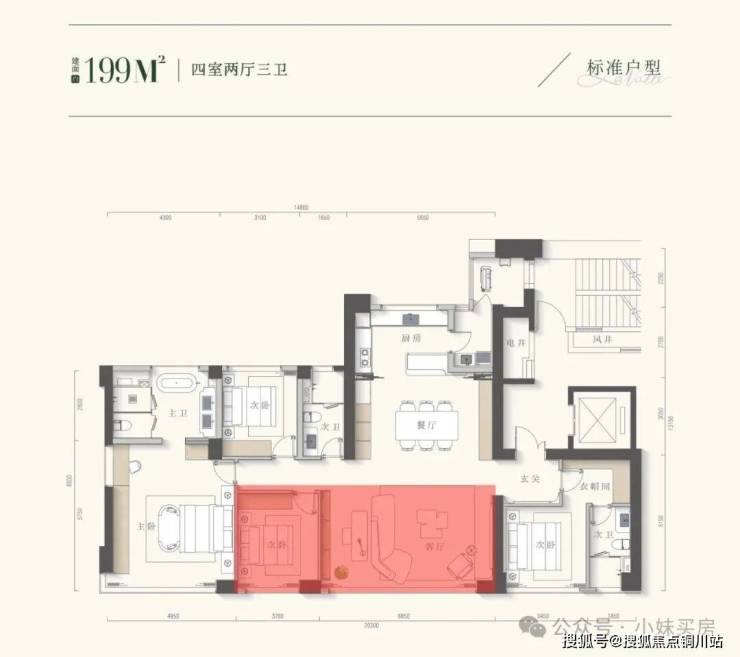 备受市场青睐的建面约199㎡户型,在此前四房两卫的基础上,升级为四房三卫。这一改动看似细微,实则精准回应了高端改善家庭最核心的痛点:家庭成员私密性与生活便利性的双重提升。