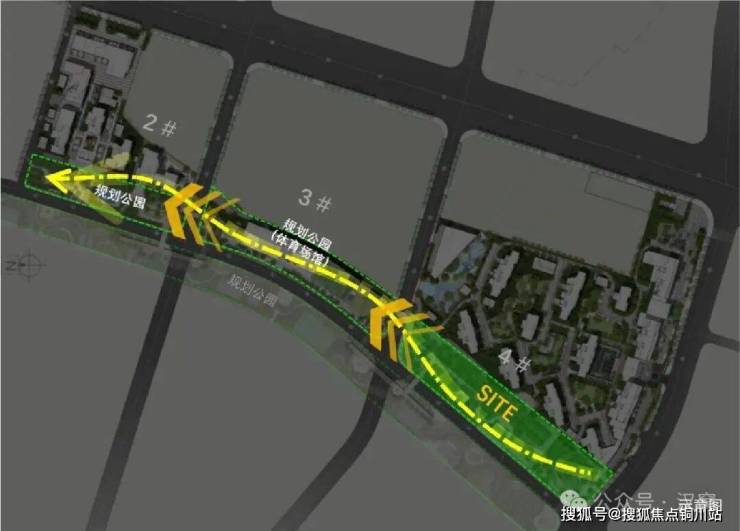 1号楼位于2号地块最北端,北面紧邻江印小区,南面、东面为二期其他住宅,西面为公园;3号楼位于地块中部,朝向较为方正;2号楼和4号楼则位于地块南侧,朝向解放大道。