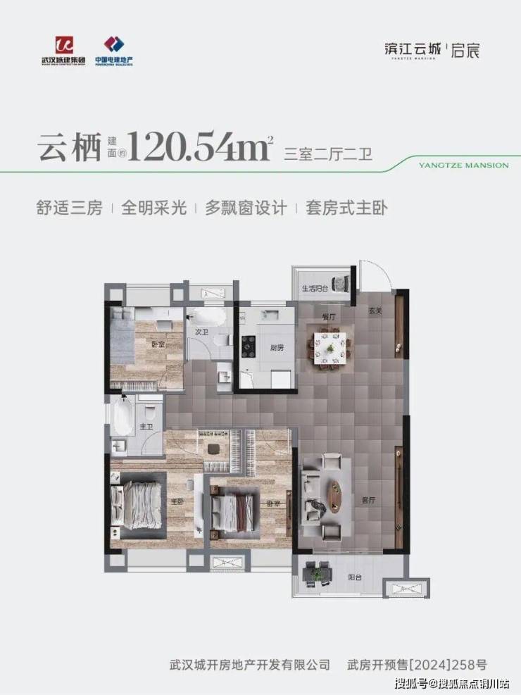 再如建面约120㎡三房两厅两卫户型,突破性做了边户,除了南向阳台,还新增了北向生活阳台,客餐厅一体化,主卧套房设计,加上全屋飘窗,空间、尺度、功能性皆远超同类产品!