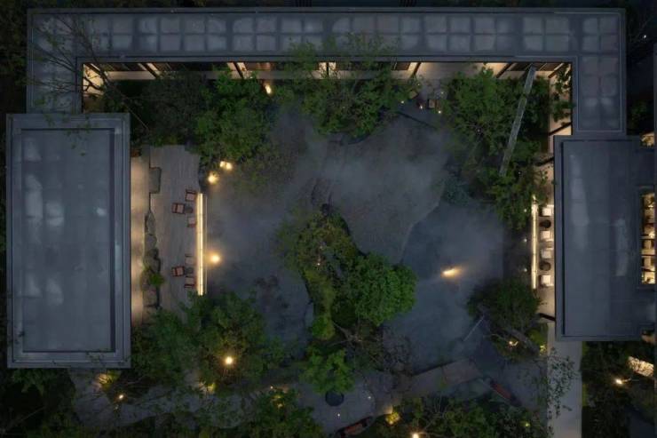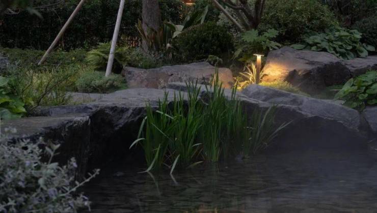 在中心庭院的设计上,我们通过大量的天然景石运用,还原大自然肌理。在池底的设计上,运用天然板岩叠拼的做法,搭配自然生境的植物组合,呈现植物与亭廊相互掩映的画面,让步行此处瞬间宛如置身山水画卷中,让居者从喧嚣的城市环境中,迅速平静下来,得到情绪的舒缓。