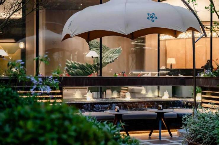经过与华丽家族共创,我们在下沉庭院打造了一个很有特色的吧台,一半室内一半室外,完全打破了室内外的物理边界,两侧巨大的推拉窗也形成了内外可以交互的界面,使得空间更为开放通透。另外下层庭院幕墙都采用落地玻璃,这也为室内空间创造了绿色窗景,使人身心得到放松。