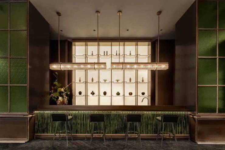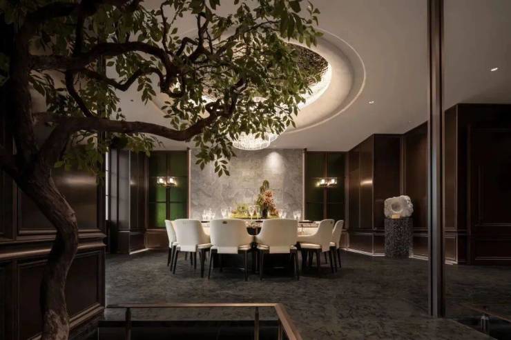 范思哲黑、挪威森林、翡翠玉石……会所空间内,不同花纹质感的高端石材碰撞出了一种典雅奢侈却低调复古的老钱风。经常被用来炫技的各种石材拼花、金属装饰线镶嵌等,在会所里随处可见。
