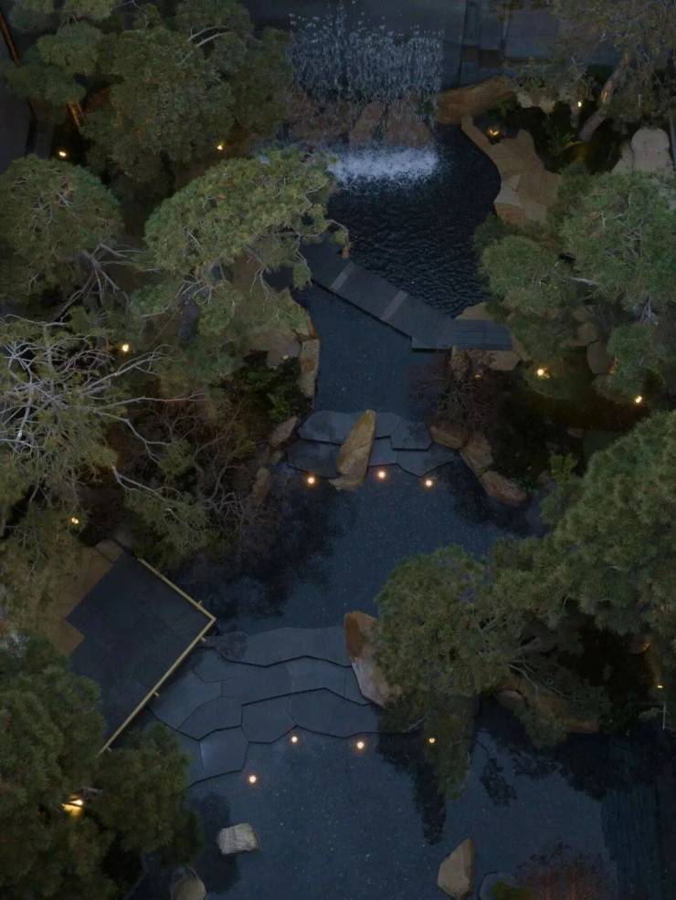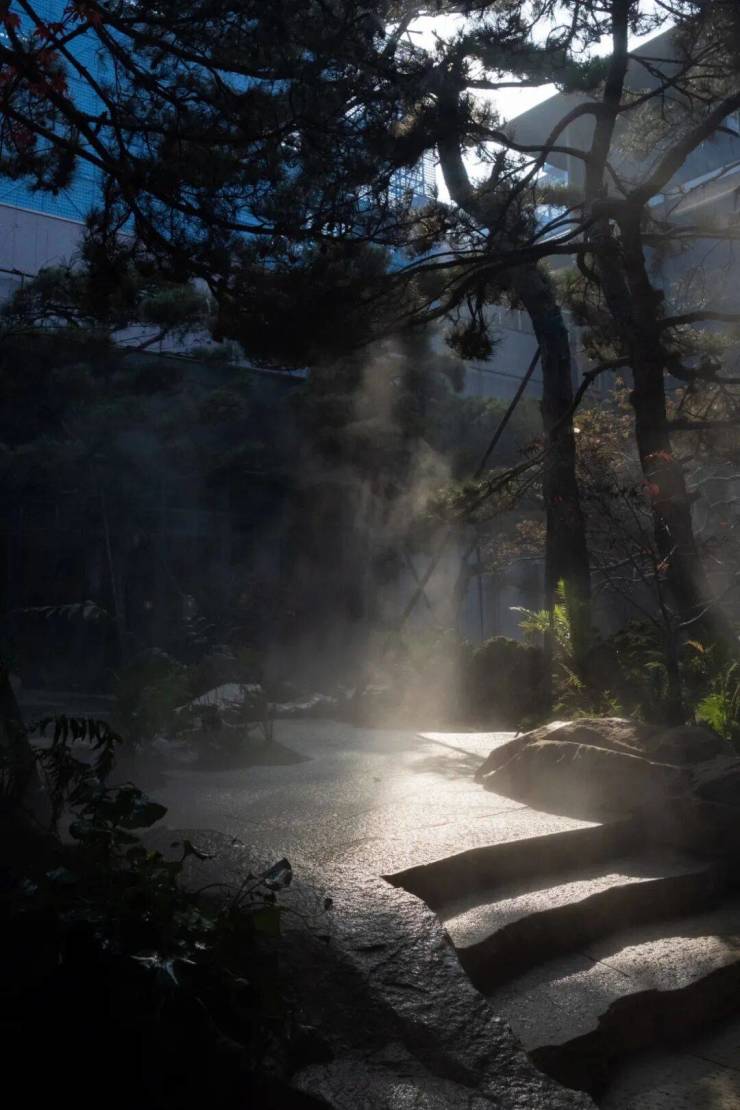 九株全冠油松以雾森为纱,在晨昏中勾勒出“松枝邀月”的剪影,脚下忽闻水声潺潺,是设计师用“八音涧”的智慧,让飞瀑在青石上弹奏的《高山流水》。
