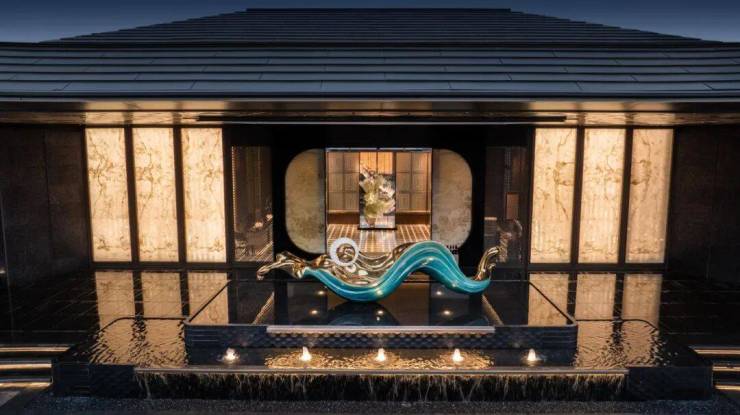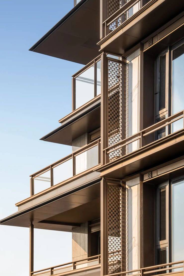 建筑面积约380㎡藏品合院,每一寸空间,都在诉说着东方雅奢的生活艺术。项目化用龙光塔的层层重檐为现代的金属挑檐,既有东方韵味,又具有时代特征。立面以“石中藏玉”美好寓意,通过金属、大理石、香槟色金属线条、石材幕墙、LoW-E中空玻璃,呈现别具一格的风雅意韵,这种对传统建筑的转译,既保留了江南的婉约,又赋予现代轻盈感。