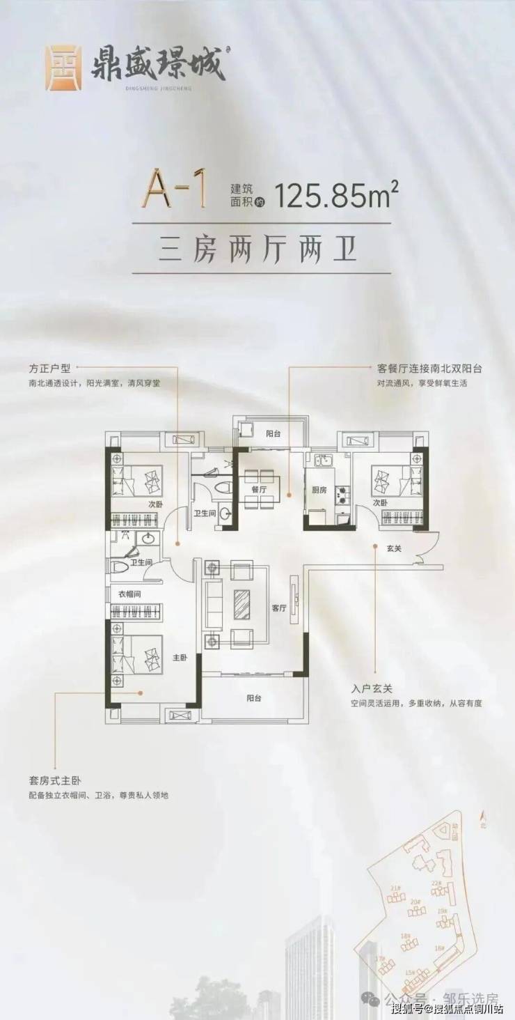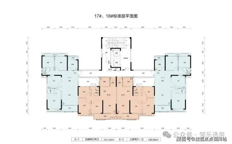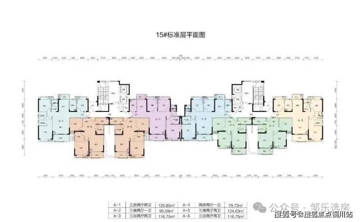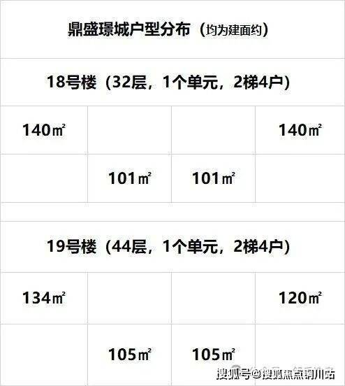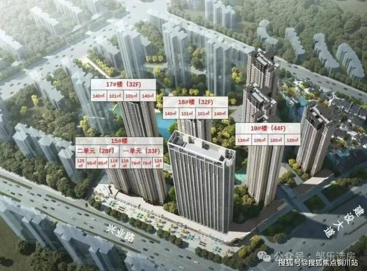 其中15号楼共33层,17、18号楼为32层,19号楼为44层,均为2梯4户。共包含建面约79-140平房源。