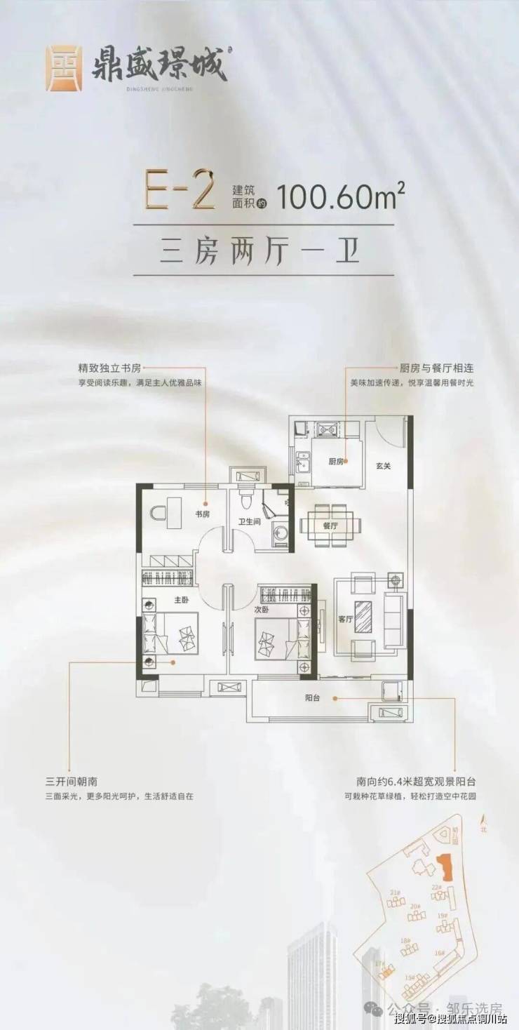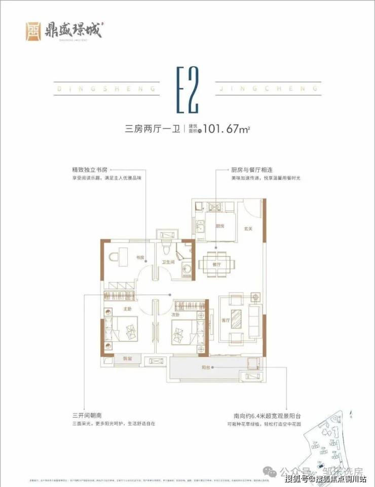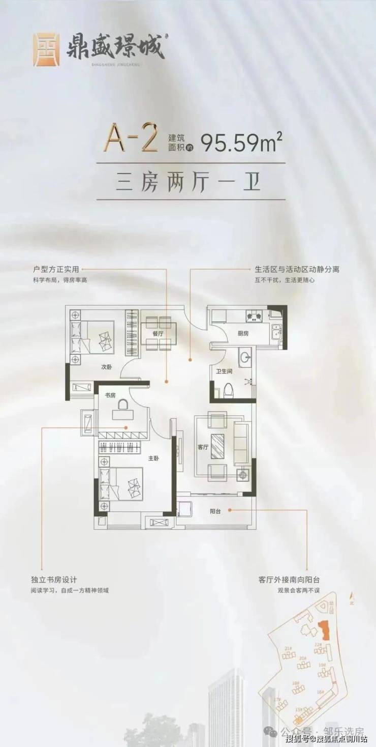 建面约95㎡ 三房一卫:15号楼中间户,该项目为上面约79㎡户型的升级版,多了一间书房,其他结构比较相近。