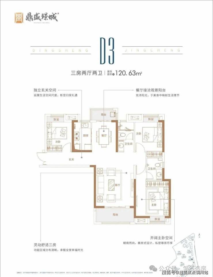 建面约116㎡ 三房两卫:两个单元连接处边户,南北通透,两开间朝南,南北双阳台,两卫格局,功能性更强。