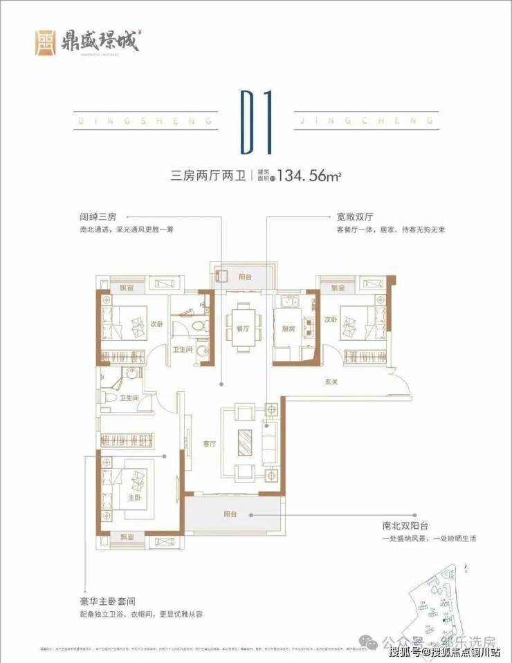 建面约134㎡ 三房两卫:边户,该户型是上面约120㎡户型的升级版,面积更大。