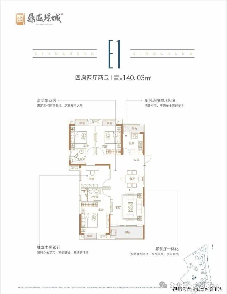 建面约140㎡ 四房两卫:两端边户,两开间朝南,三面采光,南北通透,南北双阳台+每个房配备的飘窗,不过飘窗非全面宽。