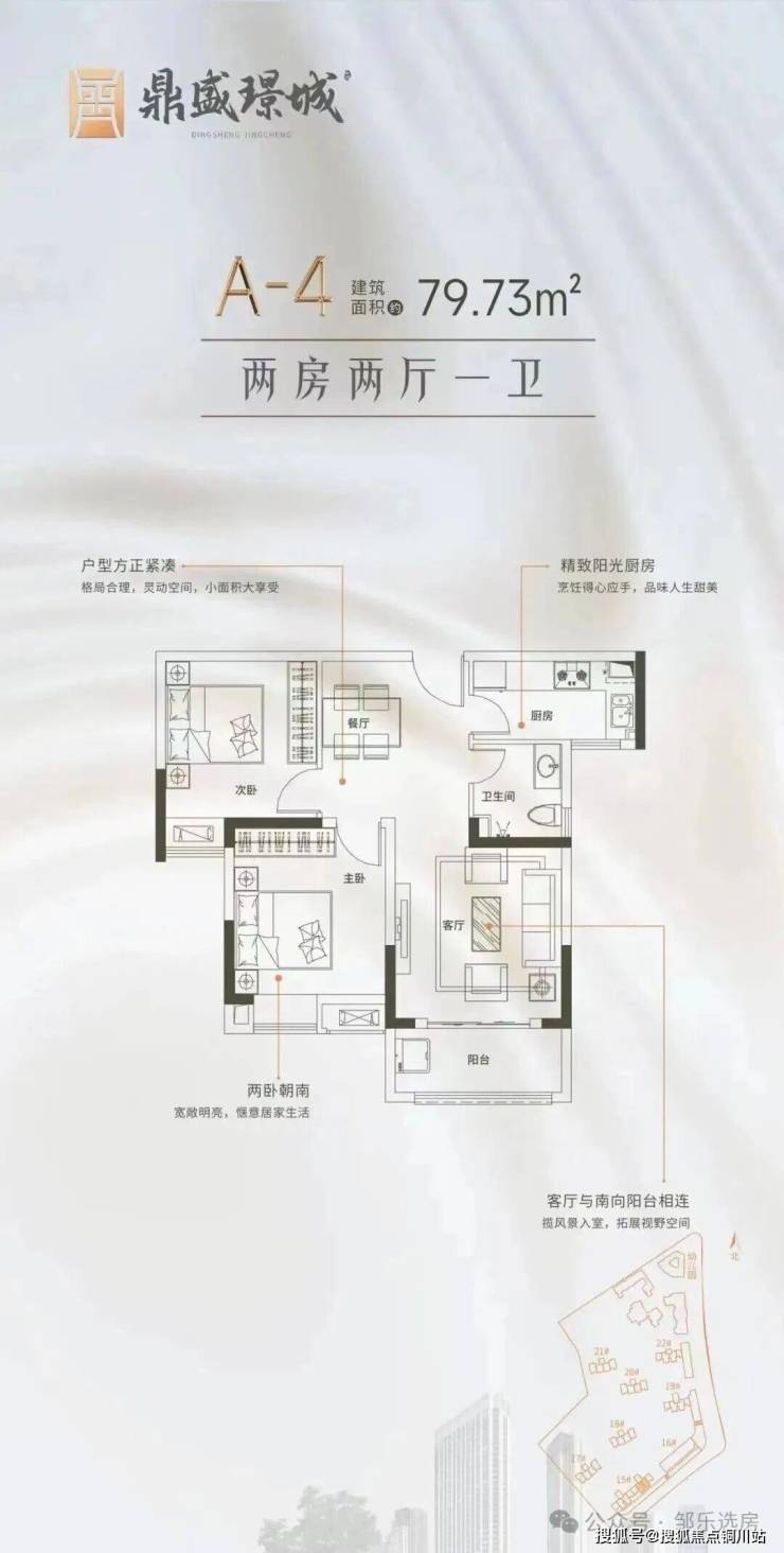 建面约79㎡ 两房两厅一卫:15号楼中间户,全朝南不通透,这个户型的优势是户型面积小,总价、首付、月供都很低。