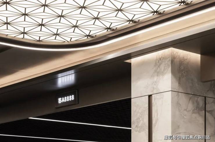 入户光厅的菱花透光云石吊顶,黑色水磨石主车道地面,豪车级车位尺度……