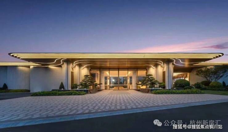 小区主入口设计为现代化酒店式门楼,跨度约66米,采用金属材质与玻璃结合。两侧石材景墙如屏风般展开,对植名贵罗汉松,整体十分气派,归家仪式感满满。