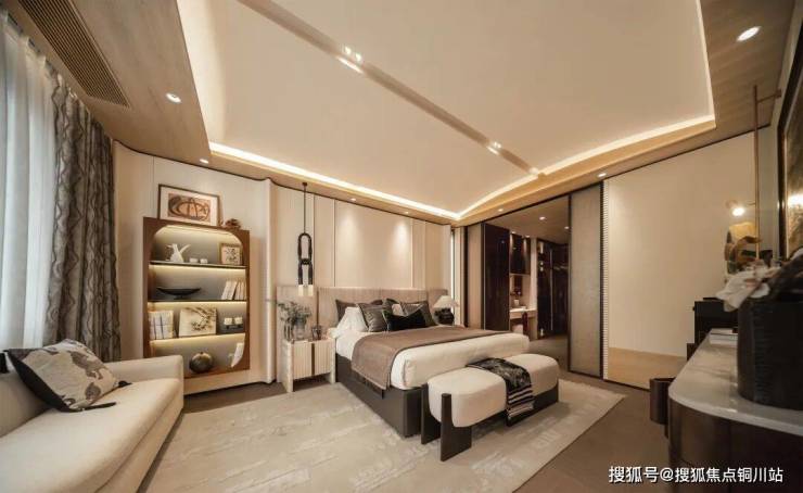 主卧区域南向豪华大套房的设计,开间约 4 米,进深约 4.5 米,尺度开阔,南侧设计落地窗,室内采光通透,走入衣帽间净深约 4.35 米,满足女主人日常收纳空间。