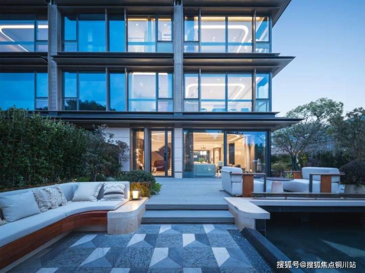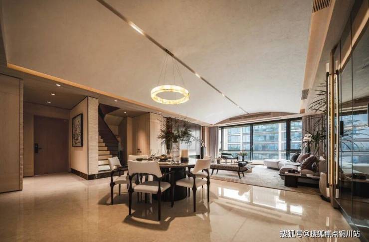 叠墅外立面以石材、铝板与南北向大面玻璃幕墙打造“经典三段式构图”;并在公建化立面基础上,新增的框景、鎏金装饰线条,辅以层层挑檐与飘檐设计,打造“檐下有屋”的东方美学。