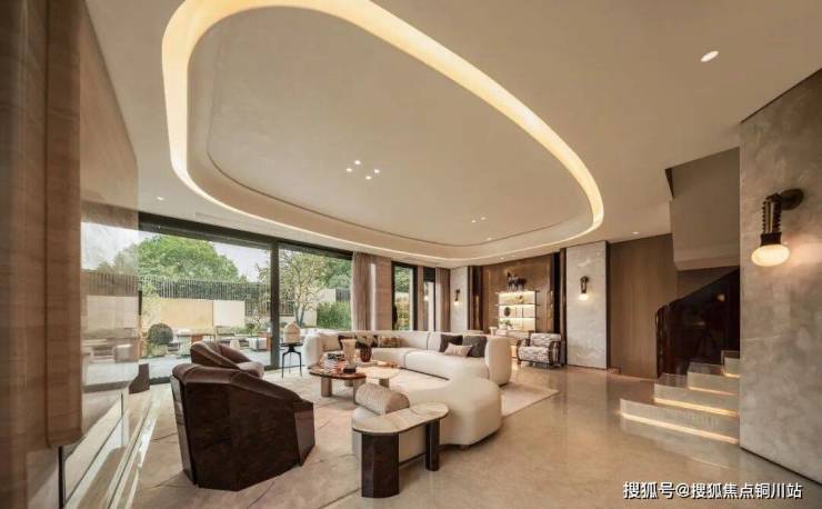 从南向庭院入户就是客厅、餐厅和厨房构成了南北贯通一体化的设计,客厅层层高3.5米,空间感极强。