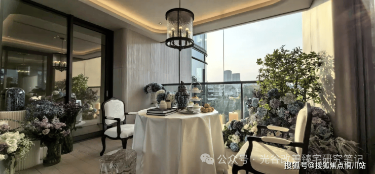 我们看看万科东合映象「光厅」的实景图,电梯门打开,就是一个有氛围感的小花园。