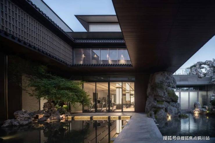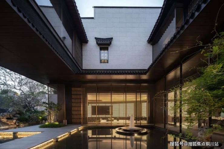 私宴厅:直面下沉庭院,整面落地玻璃引入流水景墙,横向全景界面消弭室内外边界。