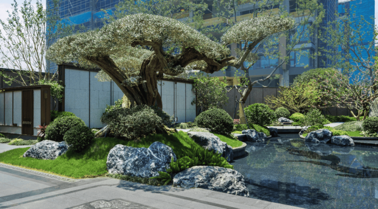 约610年西班牙油橄榄经半年运输终成镇园古树,依照《苔痕树影图》打造园林景观,6大珍稀树种构成玺云版“六君子图”,将文化与日常休闲融合,达成返璞归真的居住体验。