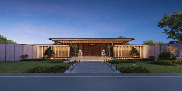 一进乘云门,以约7.2米高、约48米宽的恢弘门仪,主大门配垂鳞纹,青云桥、登云阶、威严石狮、照壁水景与挺拔罗汉松次第呈现。
