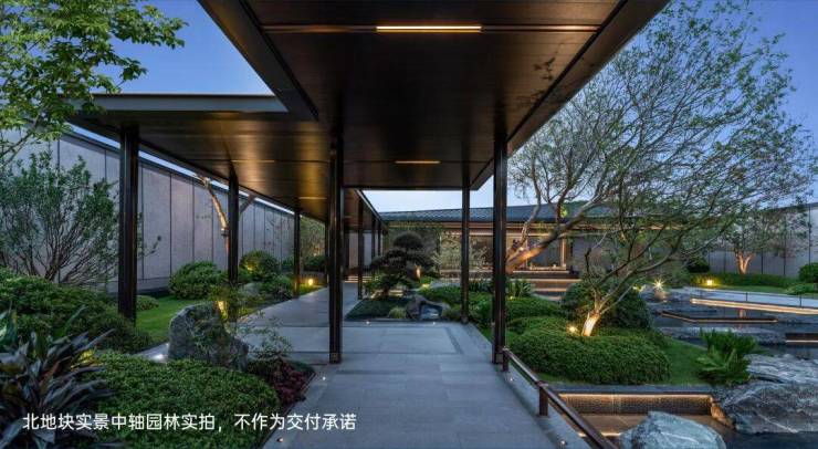 再到北地块大区中轴、归家风雨连廊实景呈现。水景、叠水、凉亭,框出一幅自然灵动的山水画卷,四周辅以各类花木,四季都有极高的观赏价值,在精心搭配设计中展现“漫不经心”的高阶审美。