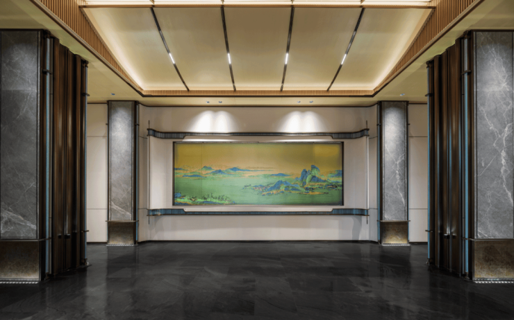 门庭中《千里江山图》展现出磅礴气韵,从入口便以恢弘气势与吉祥寓意,奠定登门望府的仪式感。