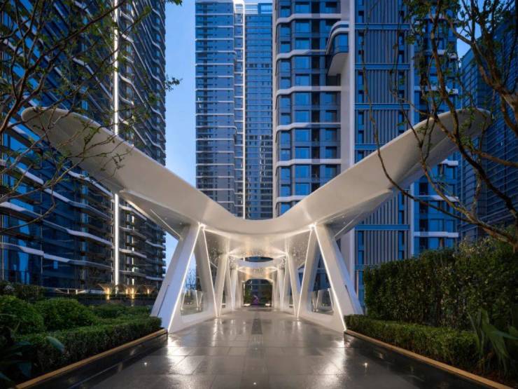 还有项目5、6号楼之间的二层连廊,原来采用的是基础造型花池设计,没有豪宅归家入户的仪式感,为此,开发商又重新设计,植入发光的“叶子”雕塑,实现了二层归家体验的质变!