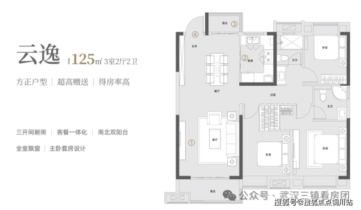 约125㎡【3房2厅2卫】南北双阳台,大尺度三房,超高赠送,高得房率