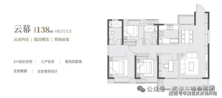 约138㎡【4房2厅2卫】四开间朝南,南北双阳台设计,IMAX景观视野