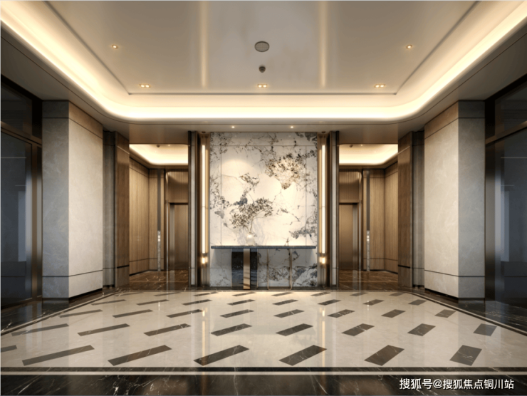 来到电梯轿厢,芬迪白岩板与墙面米色皮革硬包和柔光灰茶镜的镜面造型相结合,打破了空间的封闭感,赋予了其延伸感和肌理感。扶手部分采用咖色皮革硬包进行点缀,不仅提升了舒适度,更凸显出奢华与精致的气质。