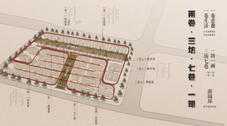 但在阅湖之星两卷、三坊、七巷、一环的宋风园林体系,打破了这一局限。我们第一次在别墅类产品中,见到这种体系化的大面积、多组团、兼具点面线的主题景观。