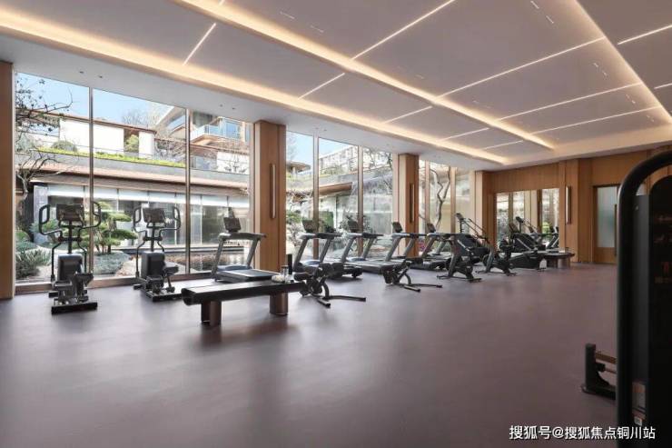 特别值得一提的是约200㎡的专业健身房,笔者看到这里配备了完善的撸铁区:跑步机、深蹲架、卧推椅等专业设备一应俱全。面对灵动园景,让健身成为一种愉悦享受。