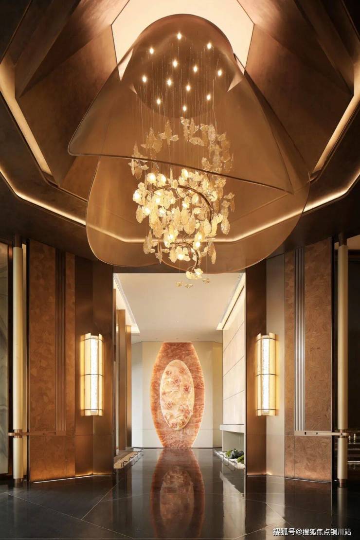 此外,约50米长的月光米黄石材连廊以6米层高和阵列柱式,在粼粼水景与架空层泛会所的映衬下,将归家仪式感推向高潮。