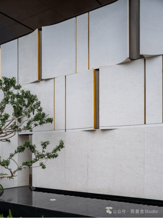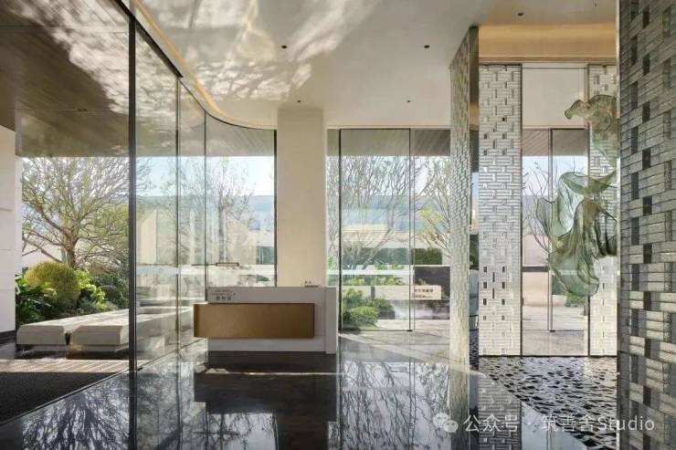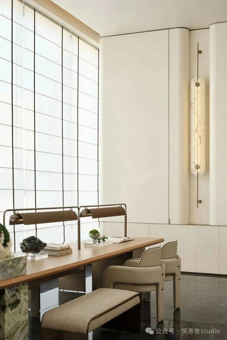 展示区配套楼建筑面积仅约400㎡,精心规划以适应未来需求。在设计阶段,巧妙运用空间与路径设计,融入灰空间、延长路径、引入自然景观、营造视觉屏障及意境联想等手法,打造出一步一景的审美体验。首层全架空设计,不仅放大了建筑体量,更形成了半室外的空间,架空连廊巧妙地将居民归家动线融入美学与生活体验的一体化设计中。步入社区门廊,转折进入景观庭院,首层空间宽敞明亮,沿顺时针动线前行,主体建筑映入眼帘,穿越水面,步入架空层空间,尽享美学与实用的和谐统一。