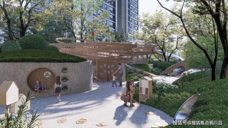 澐璟的儿童游戏探索区也并非简单地设备布置,而是与整体社区景观相互融合的一个系统。“达尔文营地”占地约2000平方米,包含恐龙造型的滑梯,恐龙蛋形状的植物标本等。这些设计旨在提高孩子们对植物的认识,并增强了空间的互动性和体验感。