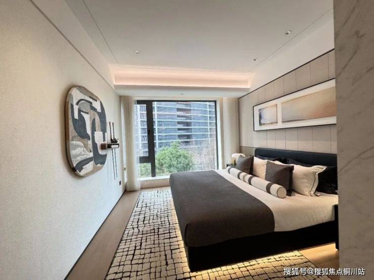 主卧采用270°转角窗、双面采光,搭配汉白玉水刀拼花,酒店式尊崇感拉满;窗面大且采用上推上置设计,安全又美观;入户前置小玄关,保障就寝私密性与仪式感,柱体极致压缩,视野与空间感更优。