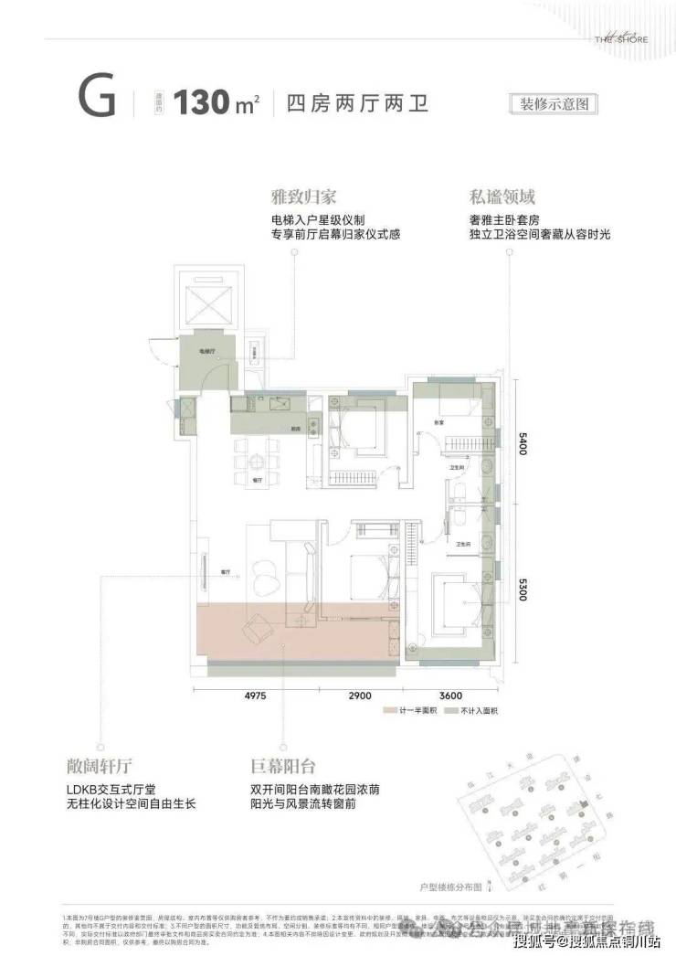 建面约130㎡的高改户型,得房率约98%,豪宅级别的独梯入户,专享私密电梯前厅。