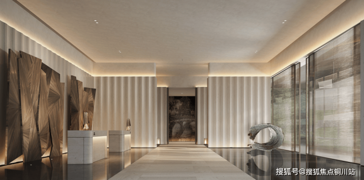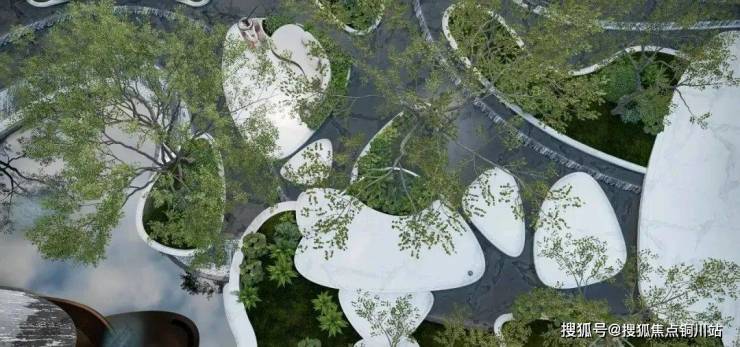 通过约3000㎡浮岛溪涧下沉庭院形成无界公园,以园林景观贯穿地上与地下,塑造视觉的垂直立体性,打破空间边界,让自然度假感完整无缺地无界流动。