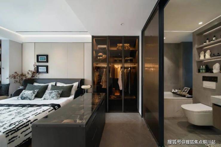 主卧套房设计,带有大飘窗、宽阔的衣帽收纳空间以及卫生间。 主卫带有浴缸,配置智能马桶,选用唯宝、汉斯格雅等一线品牌,同时也设计了壁龛,方便收纳。