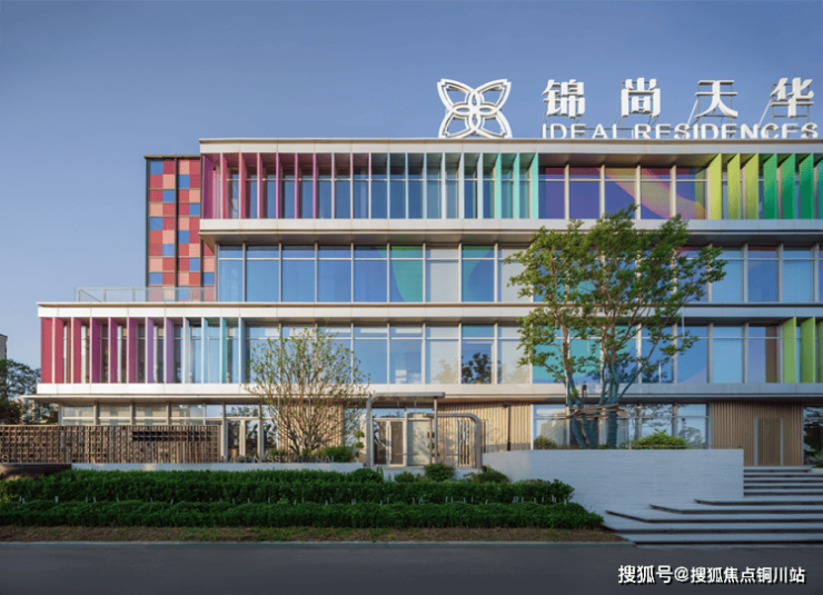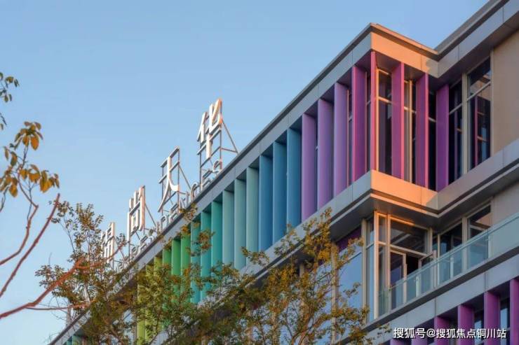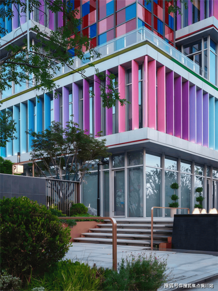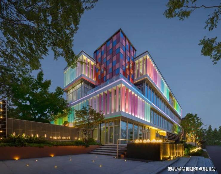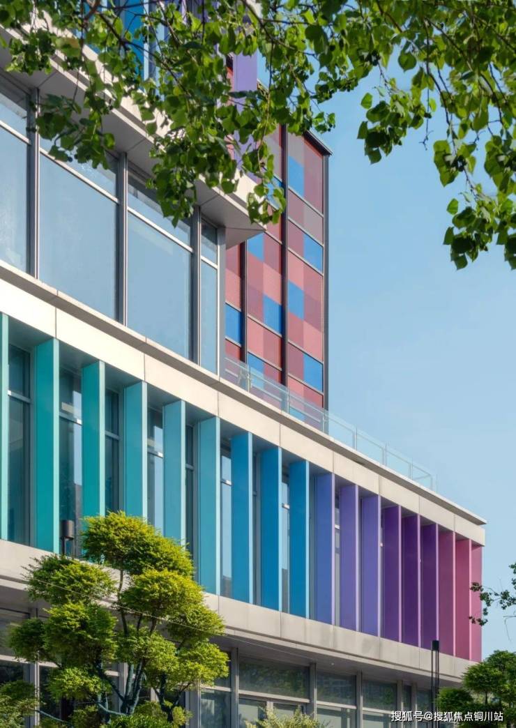 最终的立面呈现以全玻璃幕墙外挂莫兰迪色系的彩虹格栅为表皮语言,街角的跳色彩釉玻璃通高盒子打破立面格栅重复感。简洁的建筑体块、富有韵律的渐变彩虹格栅与韵律感变色灯光融合,在视觉上带给人们全新的感官体验。