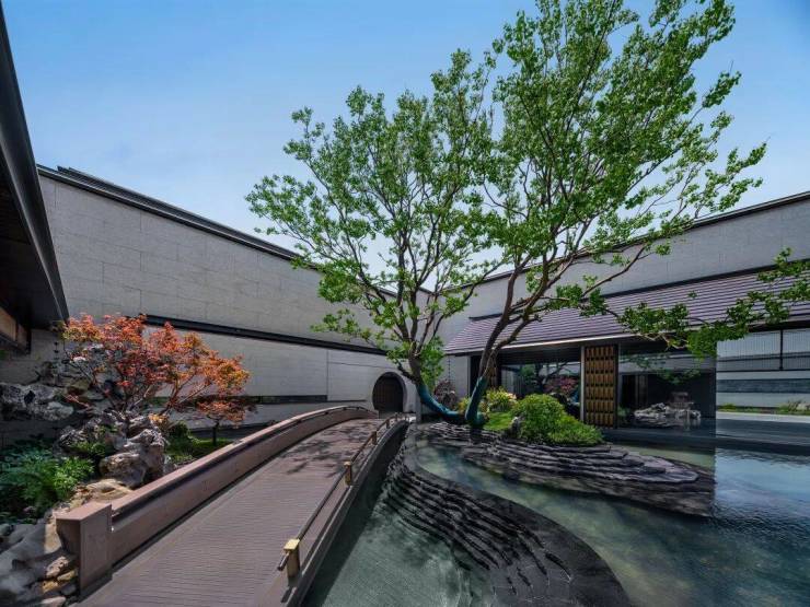 叠石理水间的设计巧思,来源于寄畅“介如峰”美人石、天下第二泉。曲折的石板桥、流水、枫叶、月洞等,在此刻,都成为致敬寄畅园的经典场景,达到“小院深藏有洞天”的境界。