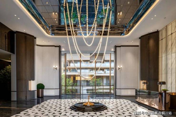 穿过气派的门头,超 10m 高的上下联动水帘瀑布,恢弘而又独具特色,视线自然过渡到约2200㎡超配独立会所。这一下沉式社交空间与入口景观形成巧妙呼应,完美阐述了“内外兼修”的设计哲学。