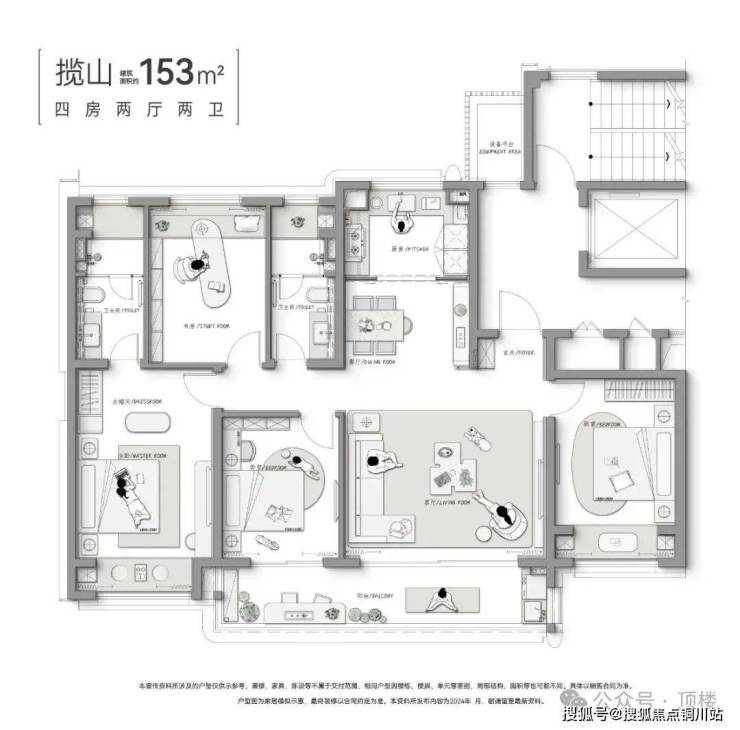 项目主推建面约153-223㎡科技美学大平层,全系四房设计,以“空间哲学”重构生活场景: