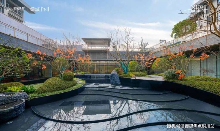景观风格以宋式园林为蓝本,景观绿植、艺术叠石、造型雕塑漂浮于镜面水景之上,交相辉映、俯仰相合。
