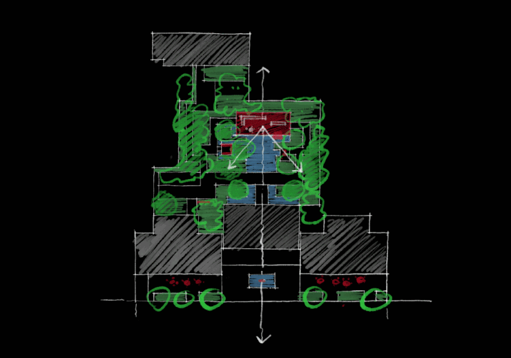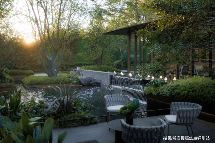 设计充分利用场地周边积极因素,溯源无锡寄畅园。巧于因借,步移景异,置石理水、曲径通幽,融入“门庭、飞瀑、水涧、雅亭、繁花、静林、醒石、清泉”古典造园元素,结合现代人审美营造东方隐奢的气质,大雅至简的空间,洄游于半山半水之间,每走一步是不同风景,每看一眼都有不同的心境。