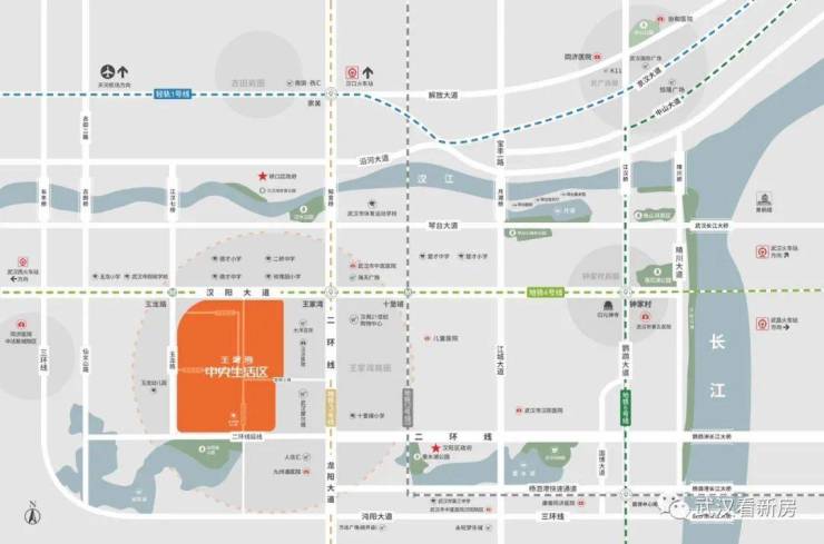 整个项目东起龙阳大道,南眺龙阳湖公园,西至玉龙路,北临汉阳大道。王家湾中央生活区占据大汉阳的核心地段,是武汉十大商圈之一王家湾商圈内最大的城市综合体,项目位于汉阳大道及二环线黄金十字轴线之上,接驳二环高架,三纵三横立体路网,迅达三镇。步行500米内即可达3/4号线双地铁“王家湾站”“玉龙路站”,同时30多条公交线路,畅达武汉三镇,出入随心。3号线是武汉地铁换乘之王,途经市民之家、王家墩CBD、王家湾商圈、菱角湖万达等,并且与其他9条地铁线路轻松换乘;4号线途经楚河汉界、中南商圈、钟家村商圈、徐东商圈、武汉火车站、武昌火车站等。